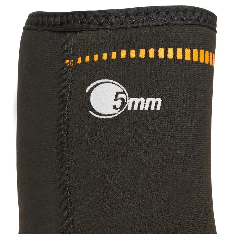 Néoprène 5 mm. Les coutures des bottillons sont étanches, assemblées en GBS (Glued and Blind Stitched) : le néoprène est collé dans un premier temps, puis cousu pour une résistance maximale (l’aiguille ne traverse pas complètement le néoprène pour éviter l’infiltration d’eau).