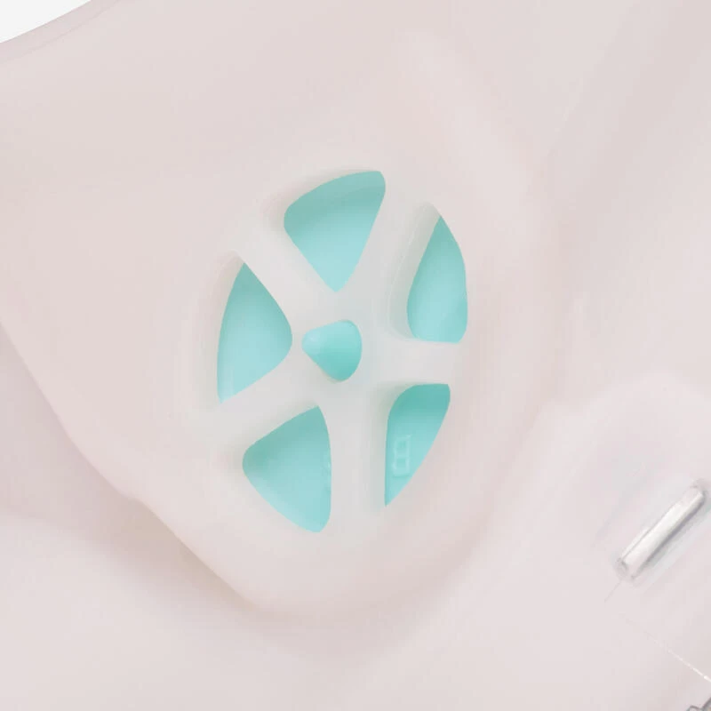 L’air chargé en humidité et CO² est évacué par des canaux situés dans le cerclage du masque qui conduisent cet air dans le tuba. L’air est constamment renouvelé. Les flux d’air entrants et sortants sont séparés évitant un remélange de l’air pollué et permettant de respirer uniquement de l’air frais.